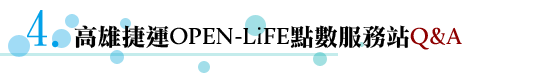 就可以用您累積的開心點換您想要的商品,或在OPEN-LiFE特約商店中悠閒地吃下午茶,與三五好友聚會,享受您的每日捷運生活。